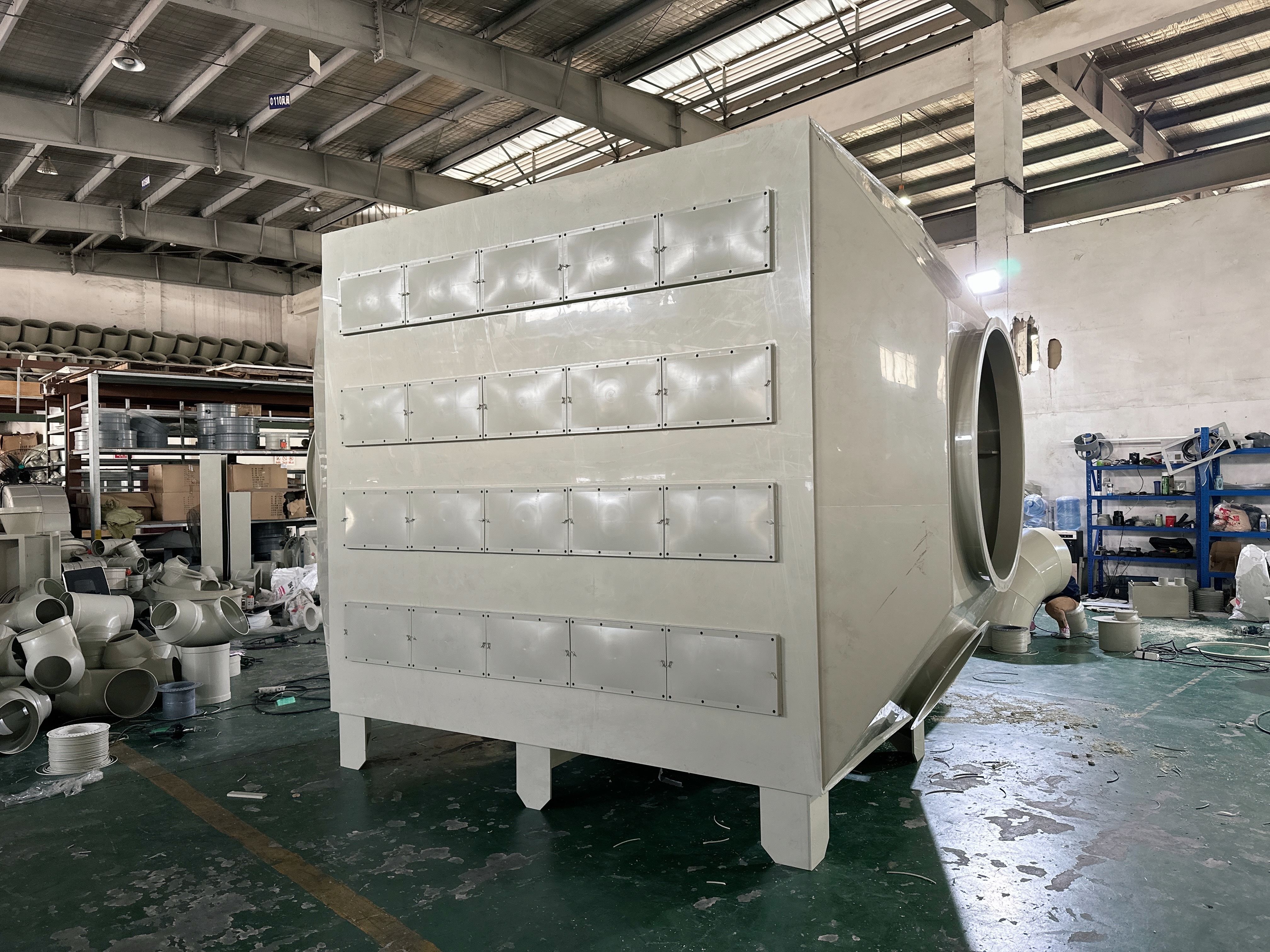 活性炭吸附箱工業VOC有機廢氣處理設備活性炭吸附箱工作原理: 當廢氣由風機提供動力,負壓進入吸附箱后進入活性炭吸附層,活性炭吸附劑的表面與氣體接觸時能吸引氣體分子廢氣中的污染物被吸附在活性炭表面上,使其與氣體混合物分離,凈化后的氣體高空排放。