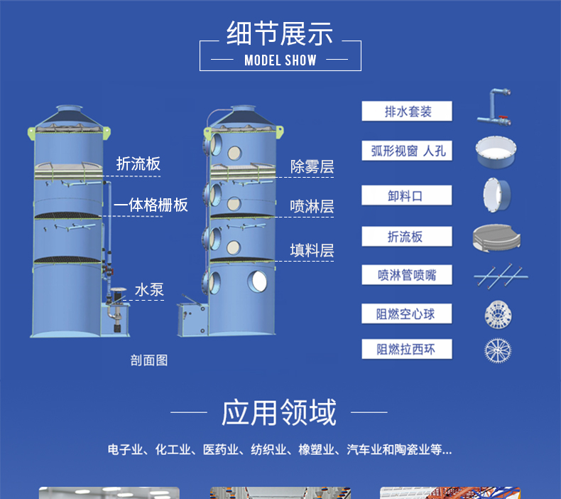 本工藝和設備可廣泛應用于化工、電子、冶金、電鍍、紡織(化纖)、食品、機械制造等行業過程中排放的酸、堿性廢氣的凈化處理。如調味食品、制酸、酸洗、電鍍、電解、蓄電池等。